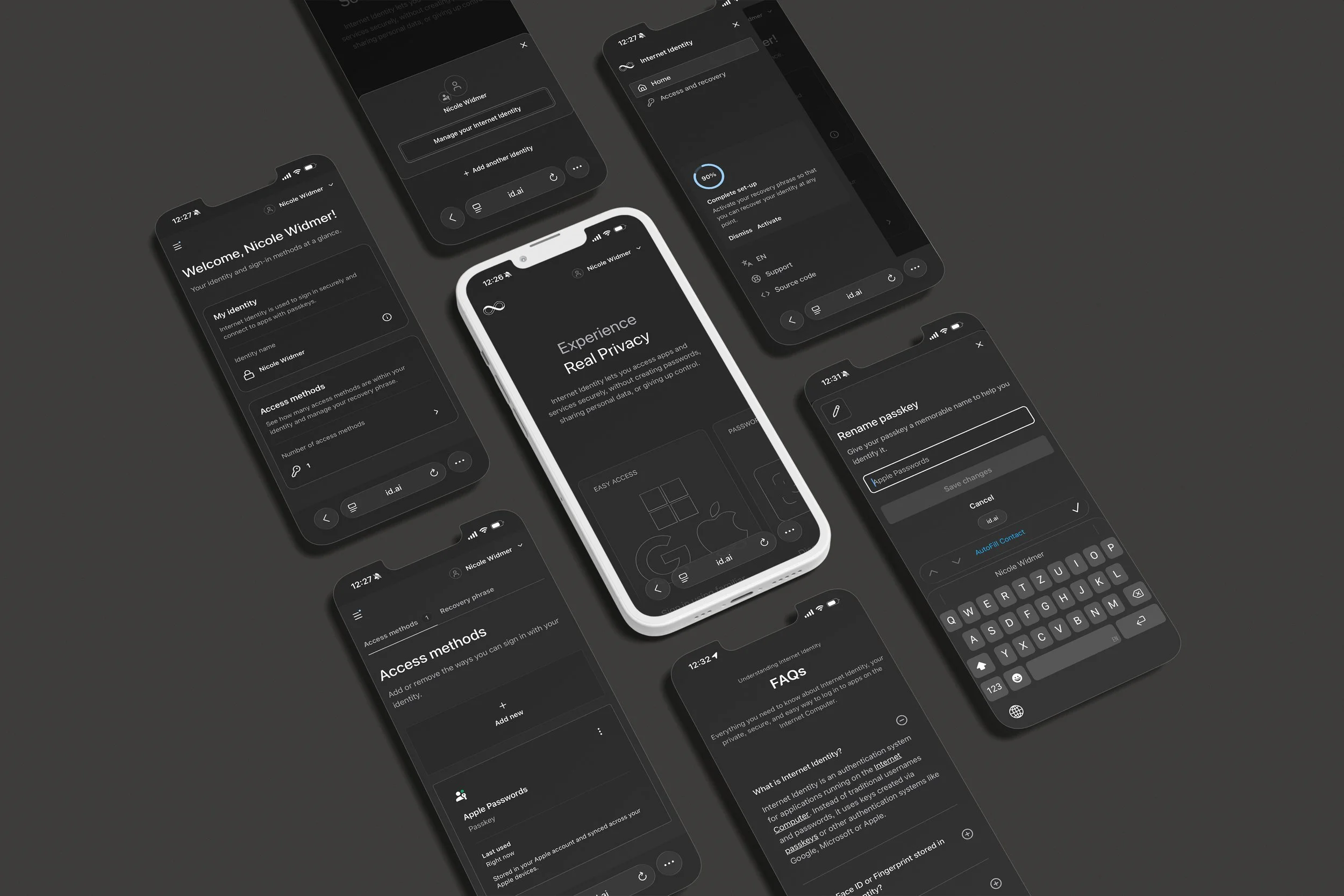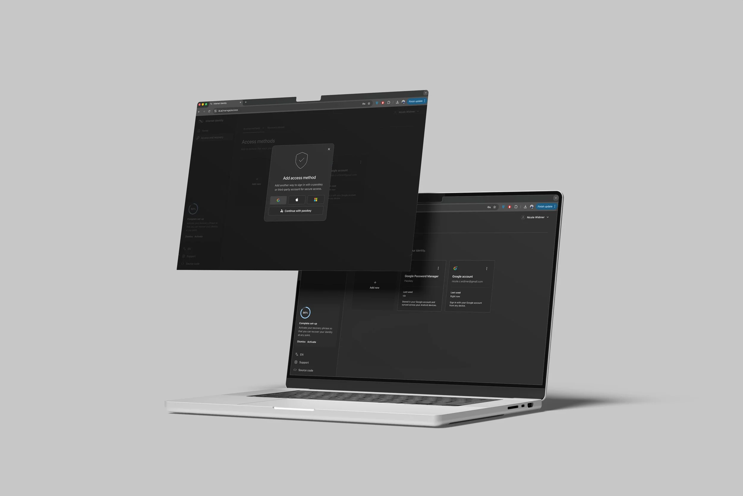 In parallel, I defined both an MVP and a future-state (horizon) vision for a unified dashboard that centralises identity management. This included enabling users to seamlessly manage multiple sign-in methods (passkeys, Google, Apple, Microsoft), view and control their linked dApp accounts, and perform key actions such as editing, archiving, or setting default accounts.