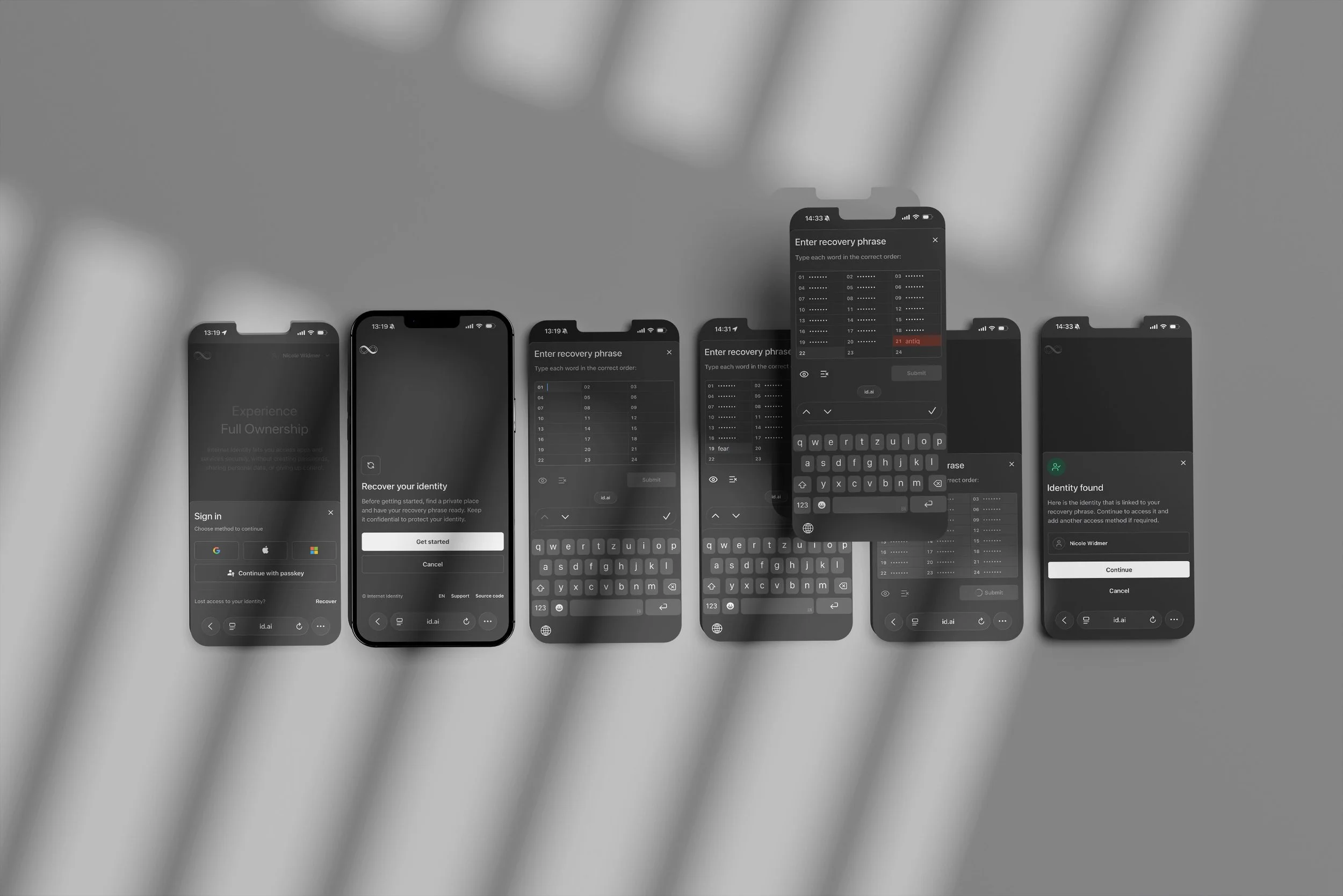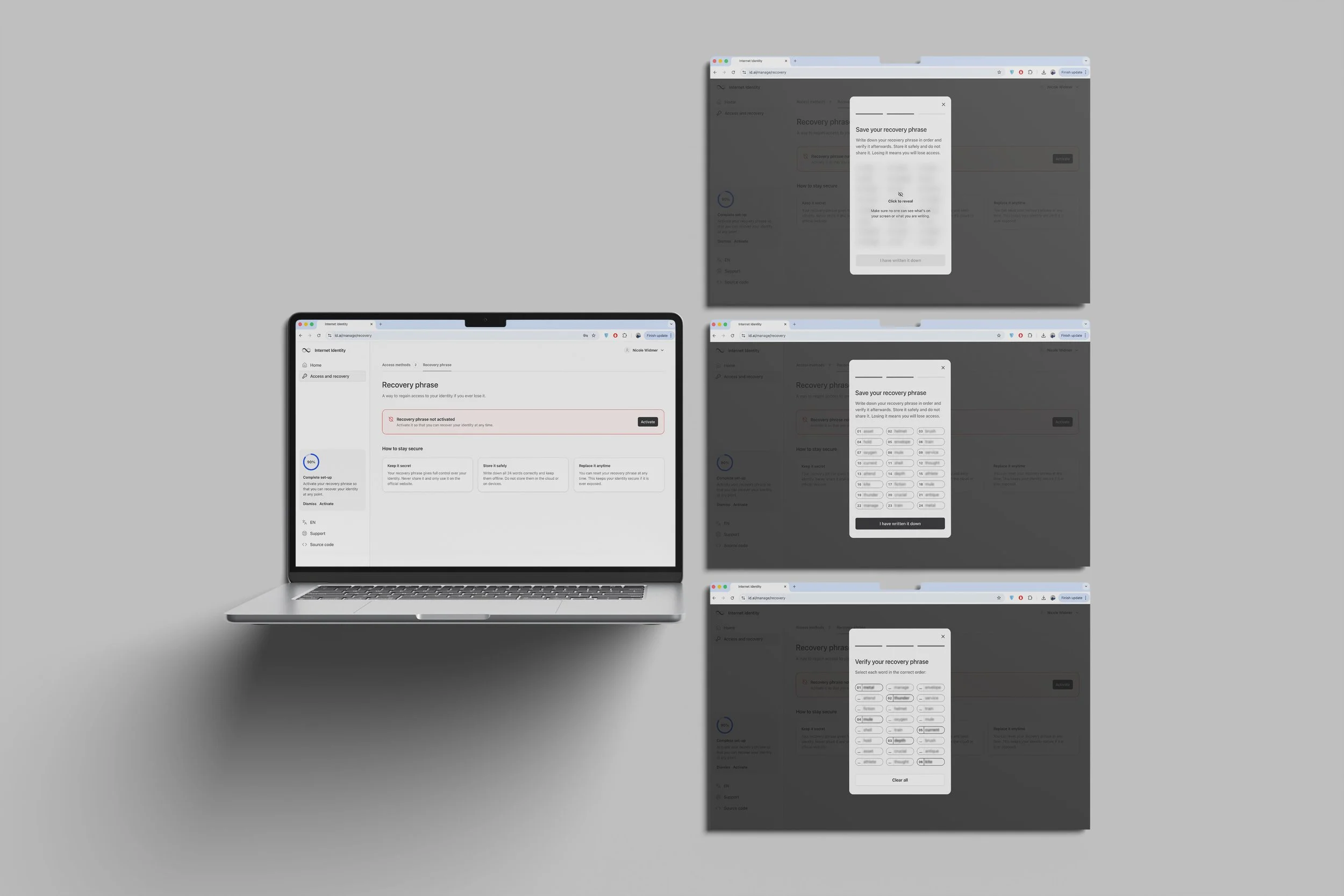 Working closely with security experts, I designed end-to-end experiences for seed phrase activation and account recovery within the dashboard. This included scenarios where users either lost access to their digital identity or chose seed phrases as their primary authentication method.